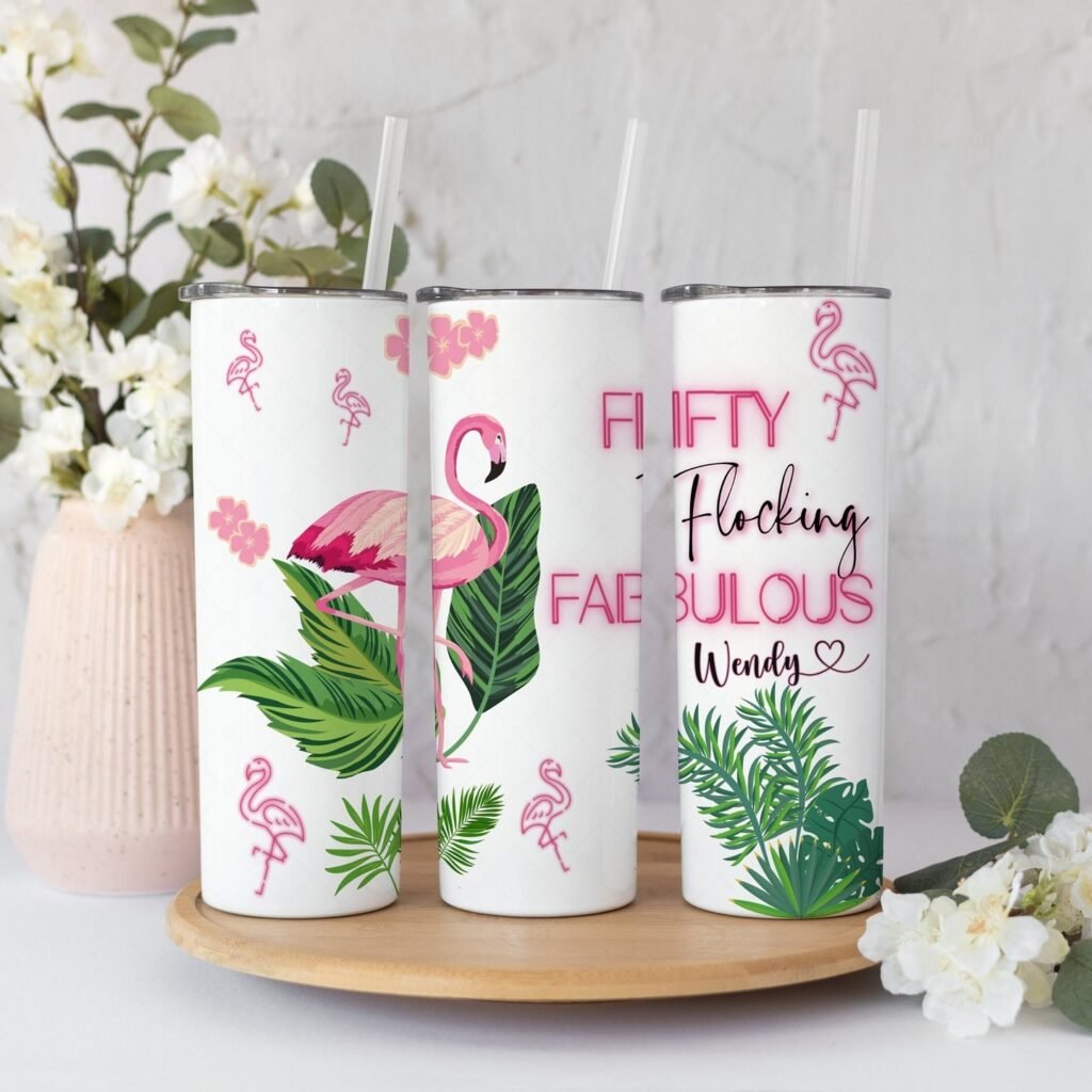 These vibrant tumblers are a charming and playful 50th birthday gift idea, perfect for someone who loves a touch of tropical flair. Each tumbler features delightful flamingo designs and lush green foliage, bringing a sunny, celebratory vibe. The playful phrase “Fifty & Flocking Fabulous Wendy” personalizes the gift, making it uniquely hers.