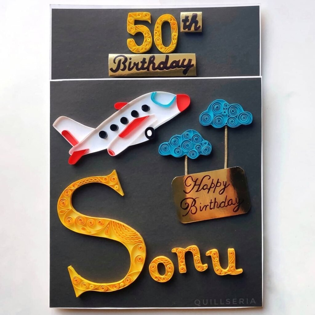 This handcrafted quilled card is an incredibly creative and personalized 50th birthday gift idea, showcasing remarkable artistry. The number “50th” and the name “Sonu” are beautifully rendered in intricate golden quilling, adding texture and a luxurious feel. A charming quilled airplane and whimsical blue clouds suggest a love for travel or new adventures.
