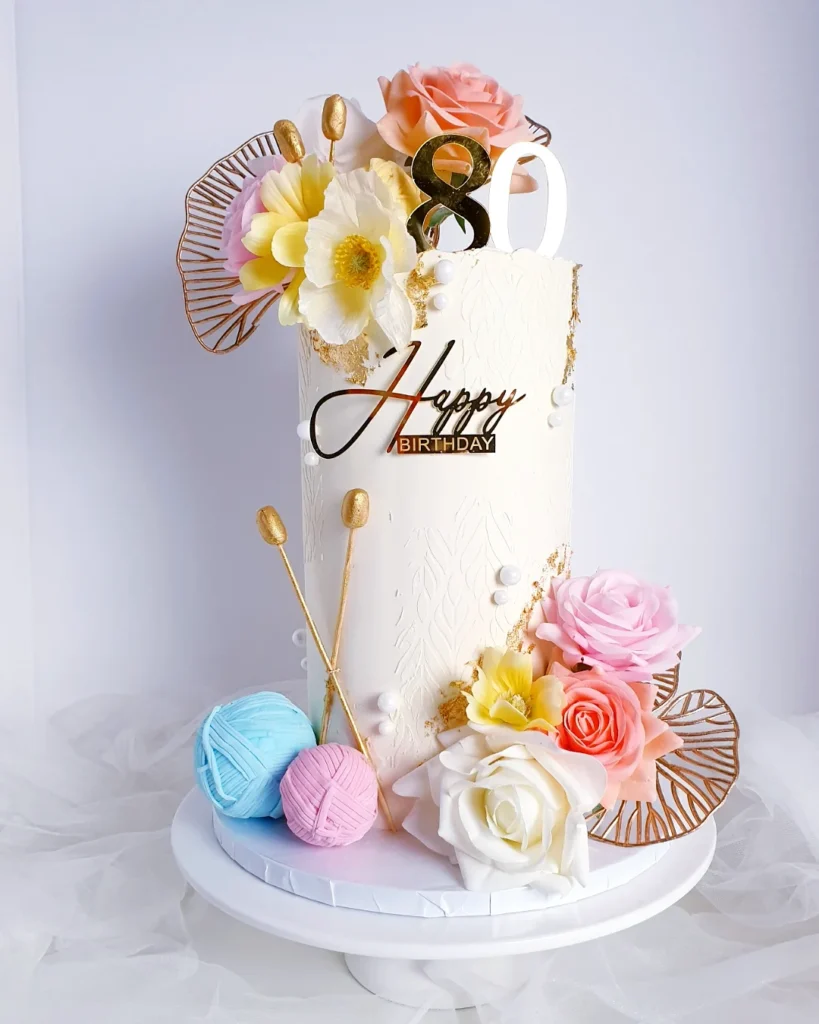 Yarn balls at the base add a personal touch for craft enthusiasts. The clean white fondant provides an elegant canvas for the intricate floral work, while the “Happy Birthday” plaque adds a classic finishing touch to this sophisticated design.