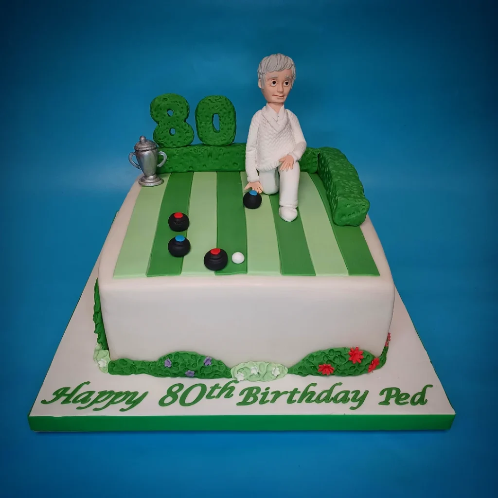 A silver trophy sits proudly at one corner, celebrating years of dedication to the sport. The detailed craftsmanship makes this cake both a centerpiece and conversation starter, perfect for someone passionate about lawn bowling.