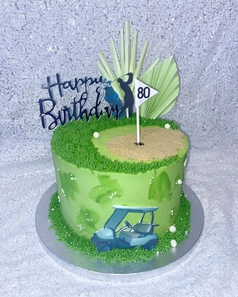 A fondant golfer silhouette takes center stage while decorative palm leaves add tropical flair. Golf balls are scattered across the “course” and a flag marks the pin. The attention to detail makes this cake ideal for any golf enthusiast celebrating their special day in style.
