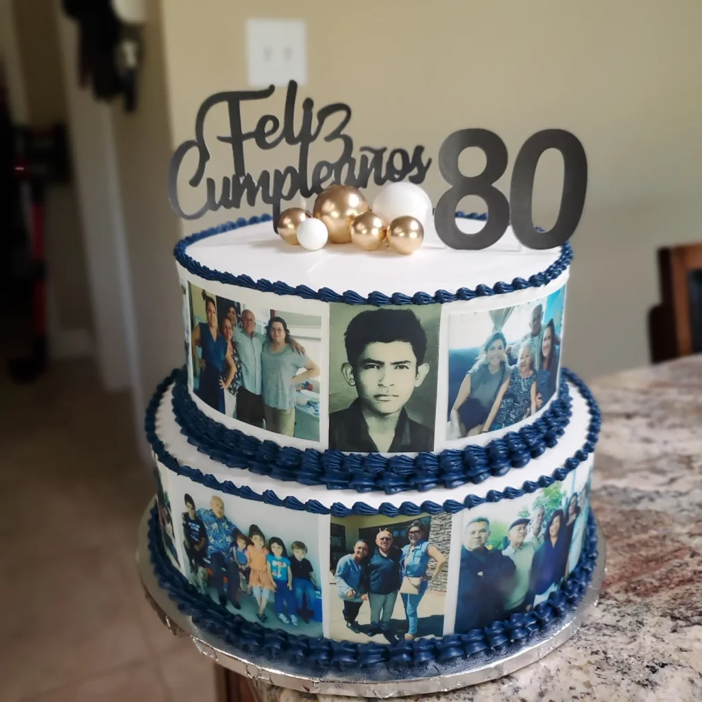 The “Feliz Cumpleaños 80” topper celebrates in loving Spanish, while golden and white spheres add festive dimension without competing with the photos. Blue piping provides elegant borders that frame each memory perfectly.