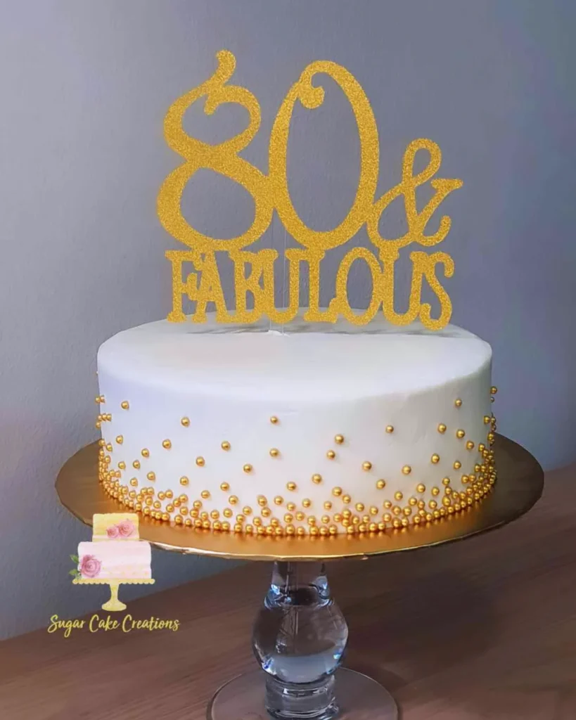 The smooth white fondant provides the perfect backdrop for the metallic accents, creating a design that feels both festive and refined. This style works wonderfully for someone who loves understated glamour and believes that turning eighty is truly something fabulous to celebrate.