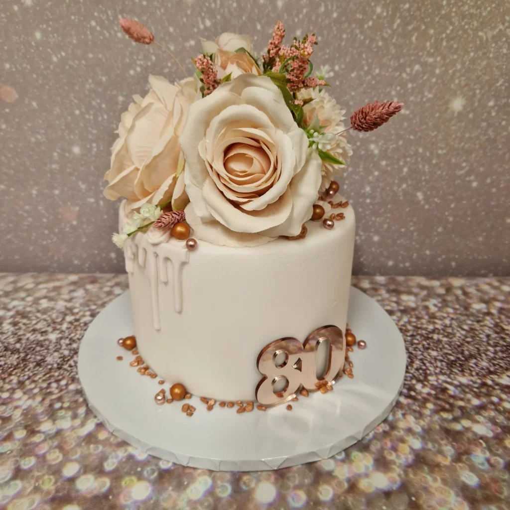The “Happy 80th” topper in gold adds celebratory flair while maintaining the cake’s gentle, personal feel. Golden ribbon wrapped around the base provides an elegant finishing touch.