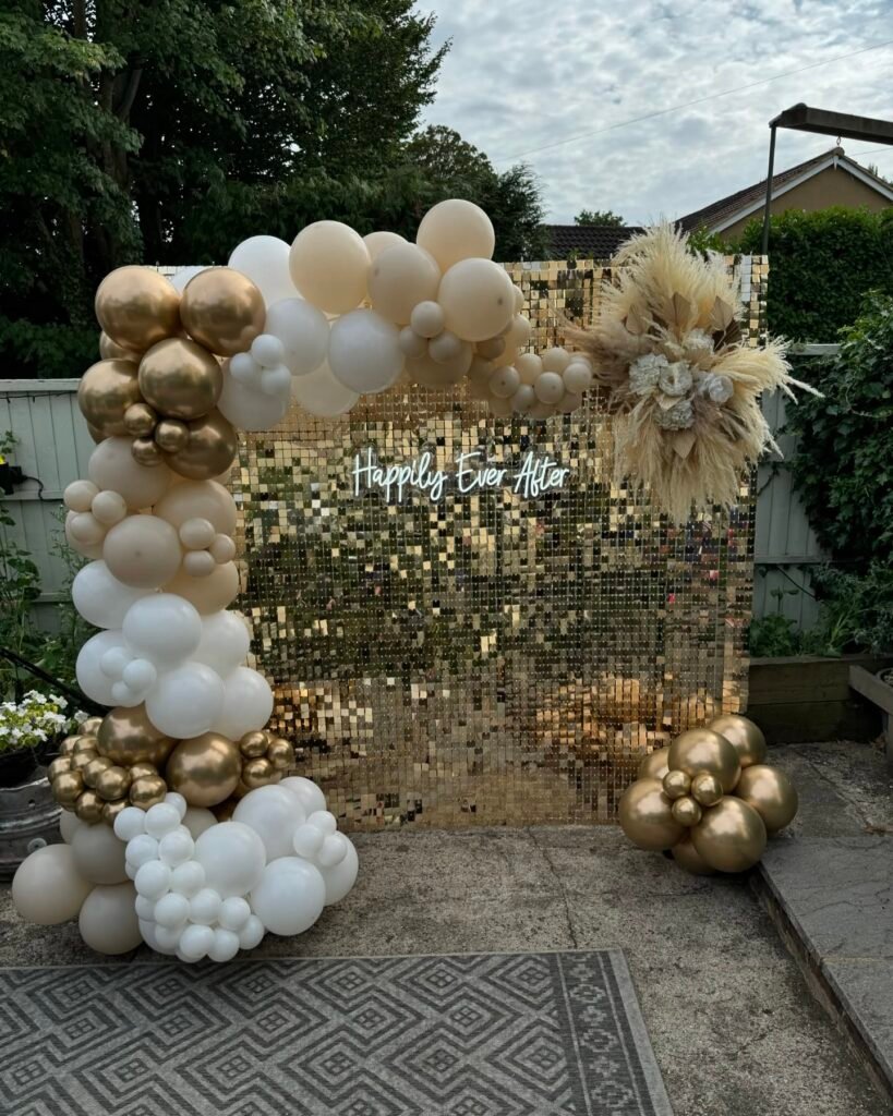 The sequined wall creates the most amazing photo opportunities for the happy couple and their guests. Those organic balloon arrangements in cream and gold tones add such beautiful dimension to the space.