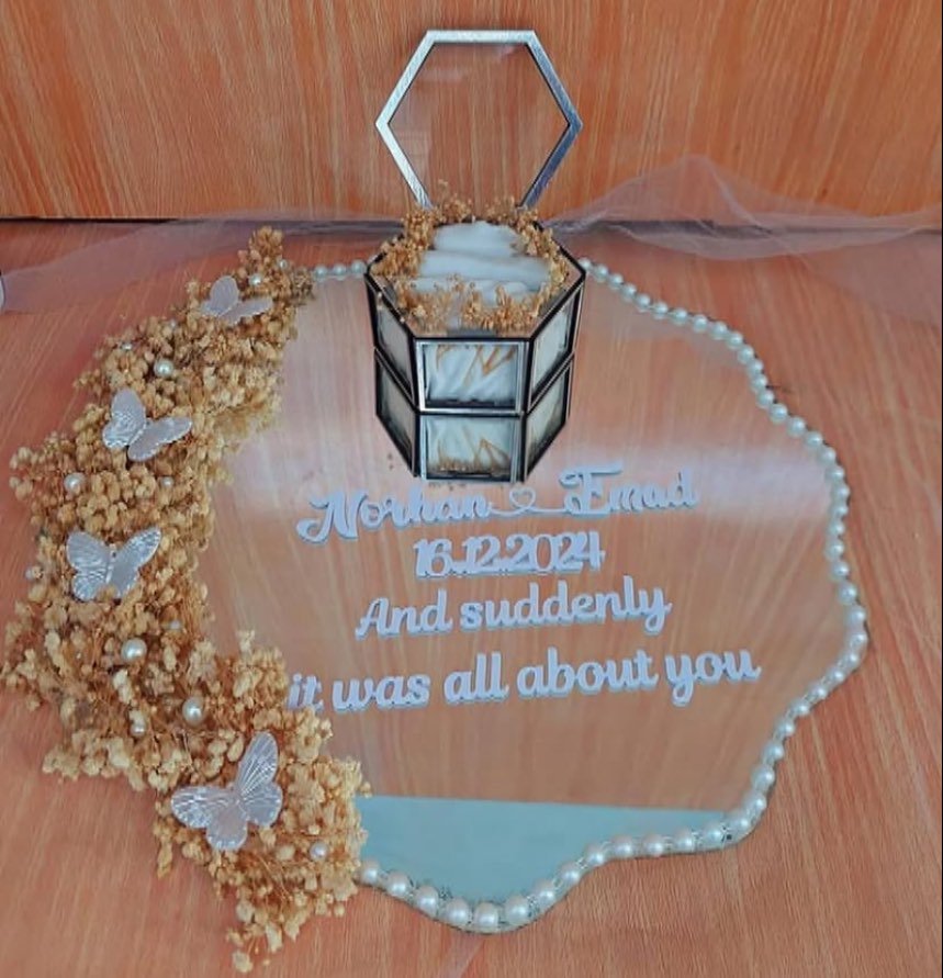 What a sweet way to capture that magical moment! This gorgeous acrylic display piece tells the whole love story with elegant dried flowers cascading around a beautiful geometric ring box.