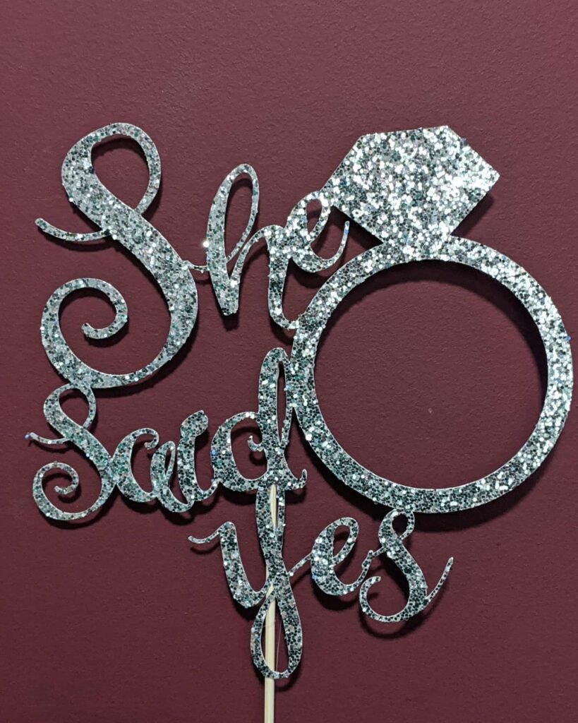 Talk about making a statement! This gorgeous glittery “She Said Yes” topper is absolutely dazzling with all that shimmer and shine.