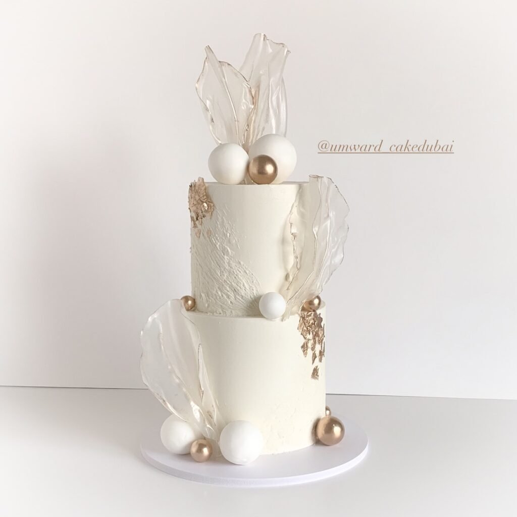 This dreamy two-tier cake is absolutely stunning with its clean white design and gorgeous clear sugar work that looks like delicate glass sculptures.