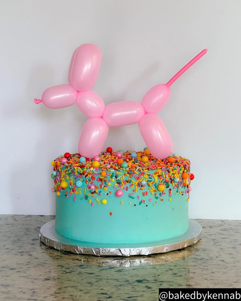 This adorable pink balloon poodle sitting atop a turquoise cake creates the perfect party centerpiece.