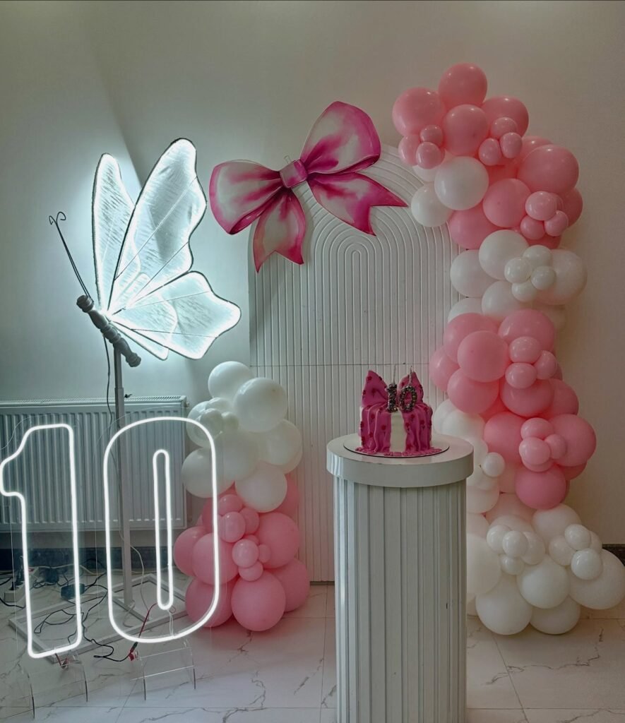This sophisticated setup features a stunning LED butterfly light fixture paired with soft pink and white balloon clusters.