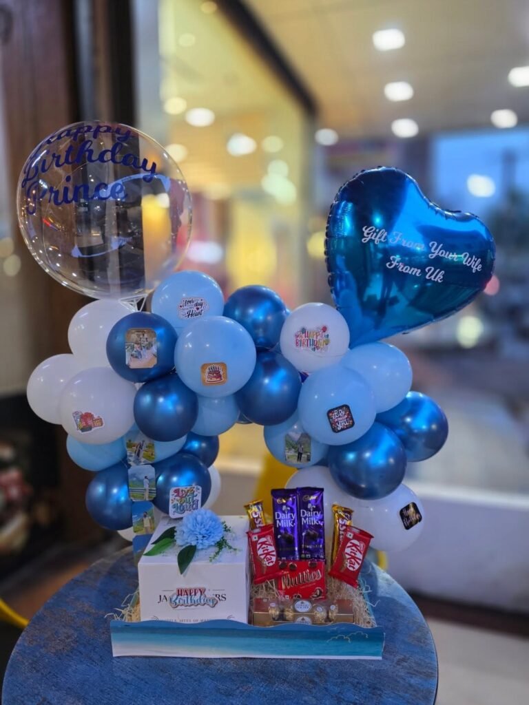 The blue and white color scheme feels fresh and modern, while the heart-shaped foil balloon adds romance. Including chocolates and treats makes it both decorative and functional.