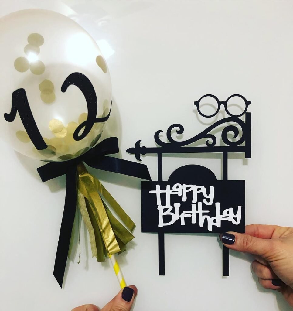 This delightful setup features a clear balloon filled with golden confetti and tied with elegant ribbons, paired with a vintage-style “Happy Birthday” sign.