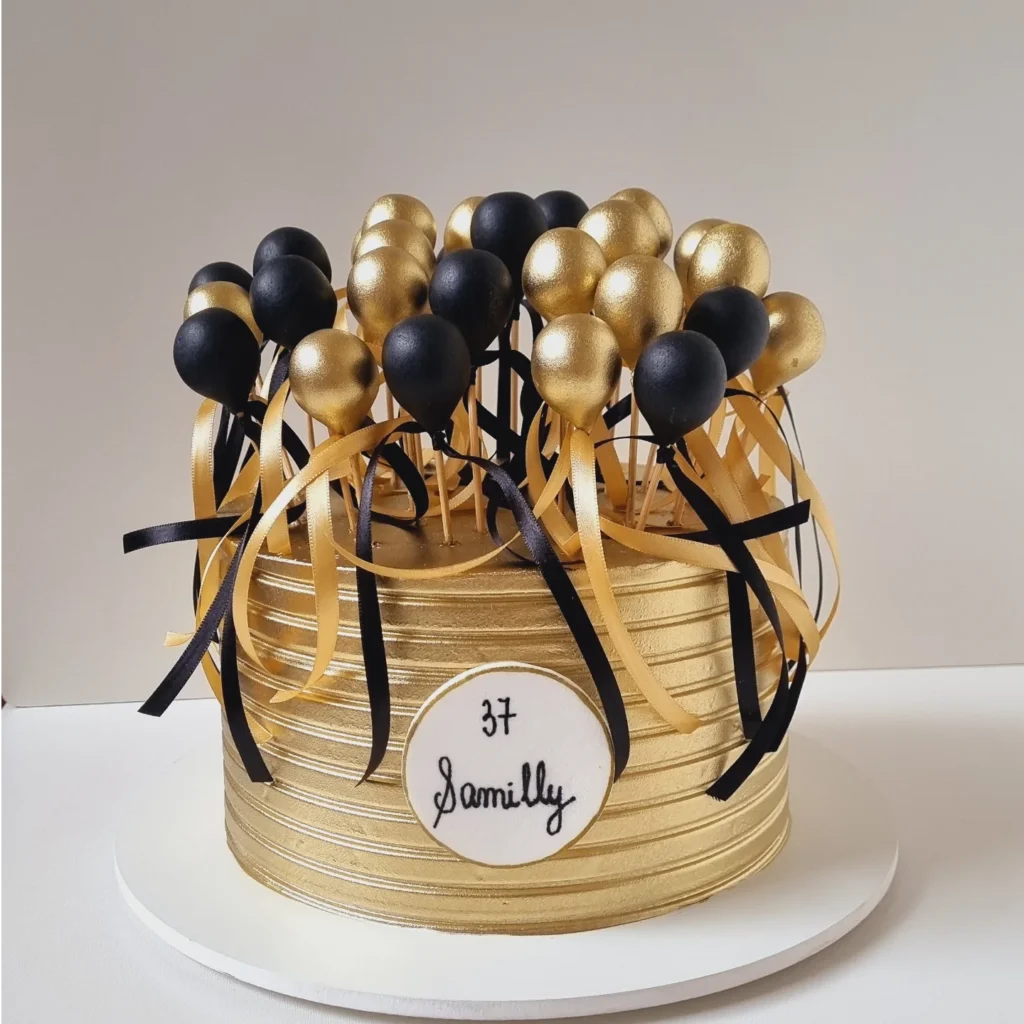 Sometimes sophistication meets celebration in the most beautiful way. This stunning cake features metallic gold and matte black balloons arranged like a bouquet, tied with matching ribbons.