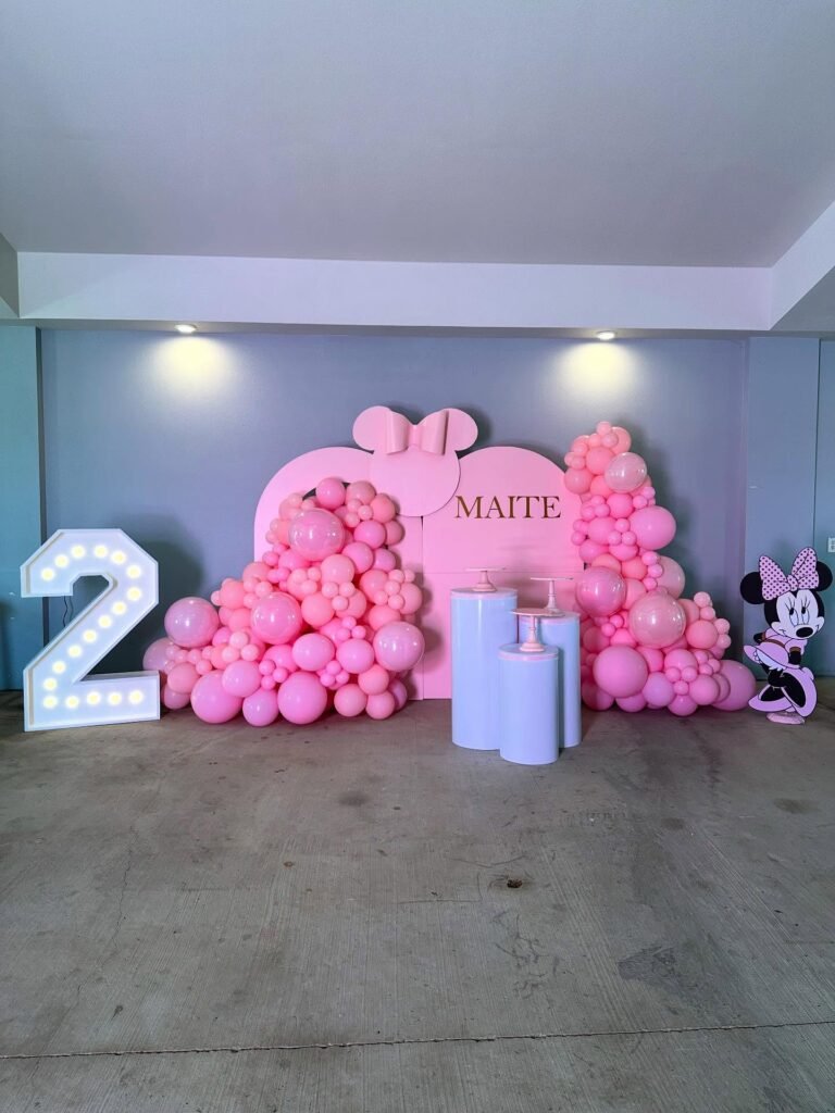This dreamy setup combines soft pink balloons with Minnie Mouse elements, creating a magical backdrop that sparkles with personality.