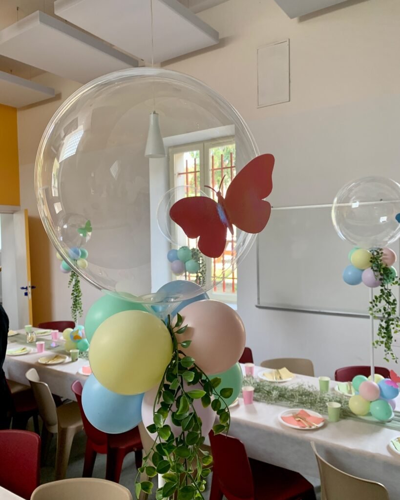 What makes this setup special is how the transparent balloons seem to float like soap bubbles, while the paper butterflies add movement and charm.