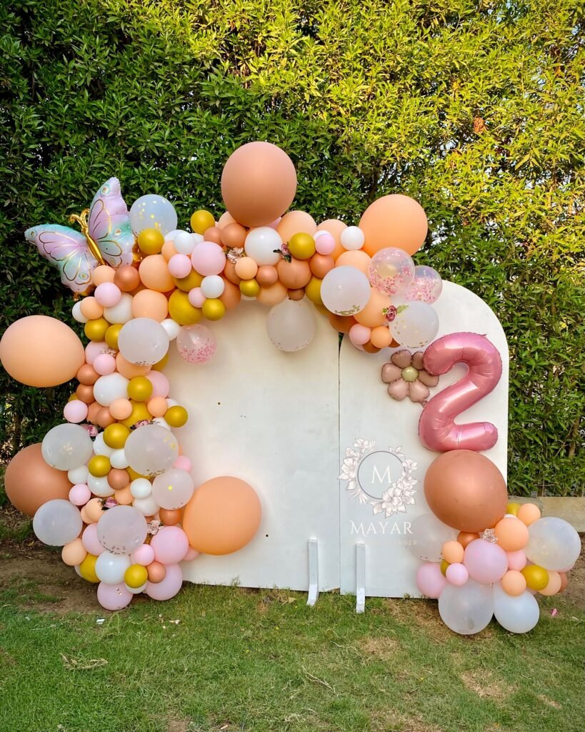 Outdoor celebrations deserve decorations that complement nature’s beauty. This gorgeous balloon arrangement features peach, pink, and gold tones that harmonize perfectly with the garden setting.
