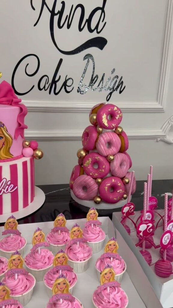 This dessert table has some of the best Barbie birthday party ideas. A tall, striped Barbie cake stands beside a tower of pink donuts adorned with gold accents. It’s a sweet feast.