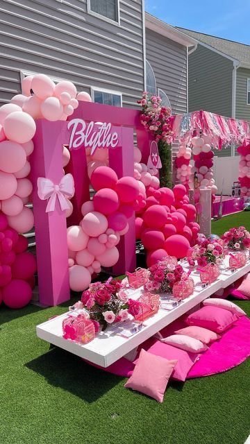 A large balloon garland in various pink shades completes the look. This setup is a chic and comfortable way to celebrate, blending outdoor fun with classic Barbie style.