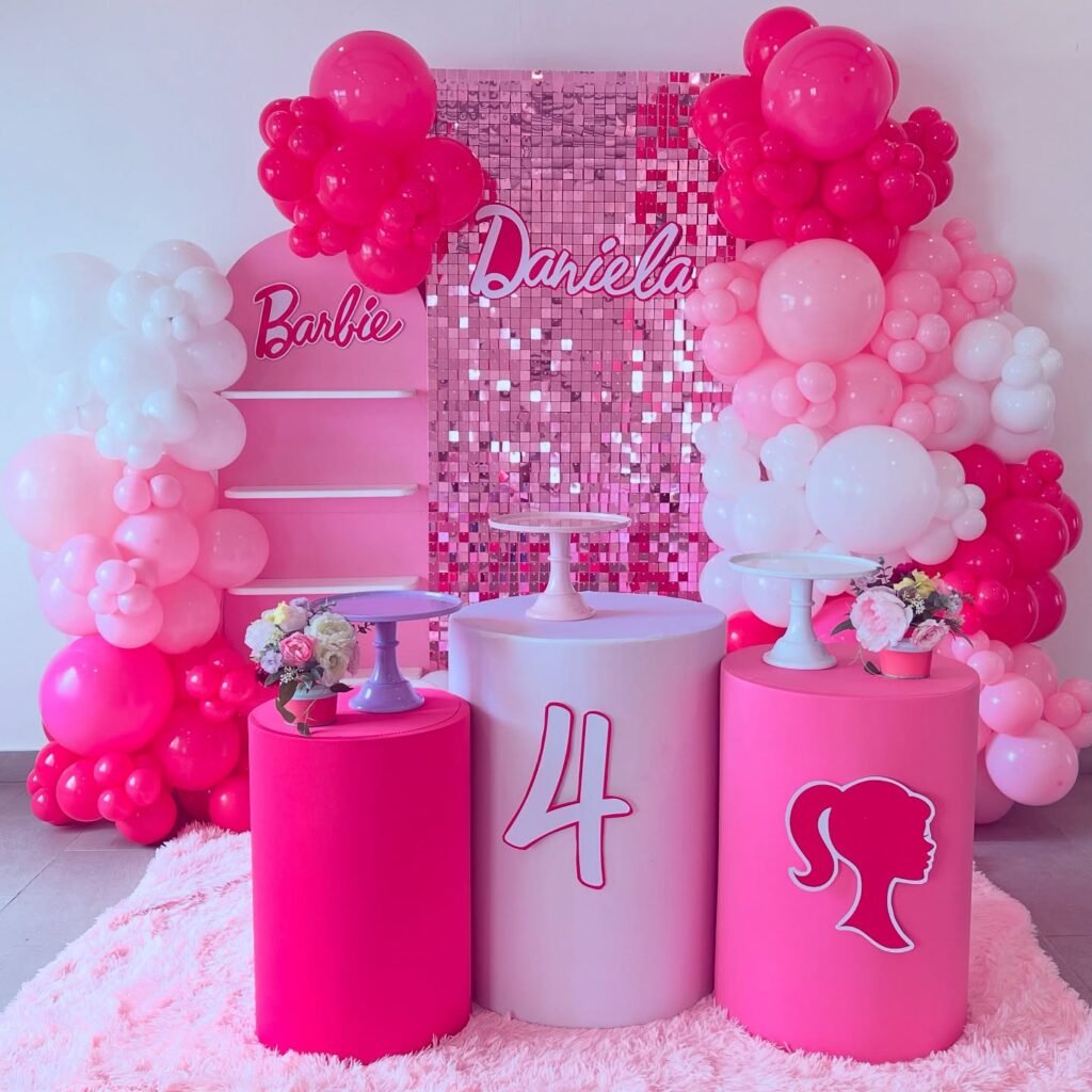 Cylindrical pedestals in various heights and colors take center stage. One features a prominent number four, another a classic Barbie silhouette, perfect for holding cakes and delightful floral arrangements.
