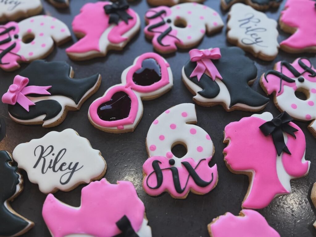The cookies feature a chic black, white, and pink color scheme. Some are personalized with “Riley” and “six,” a sweet touch that celebrates the birthday girl and her milestone age.