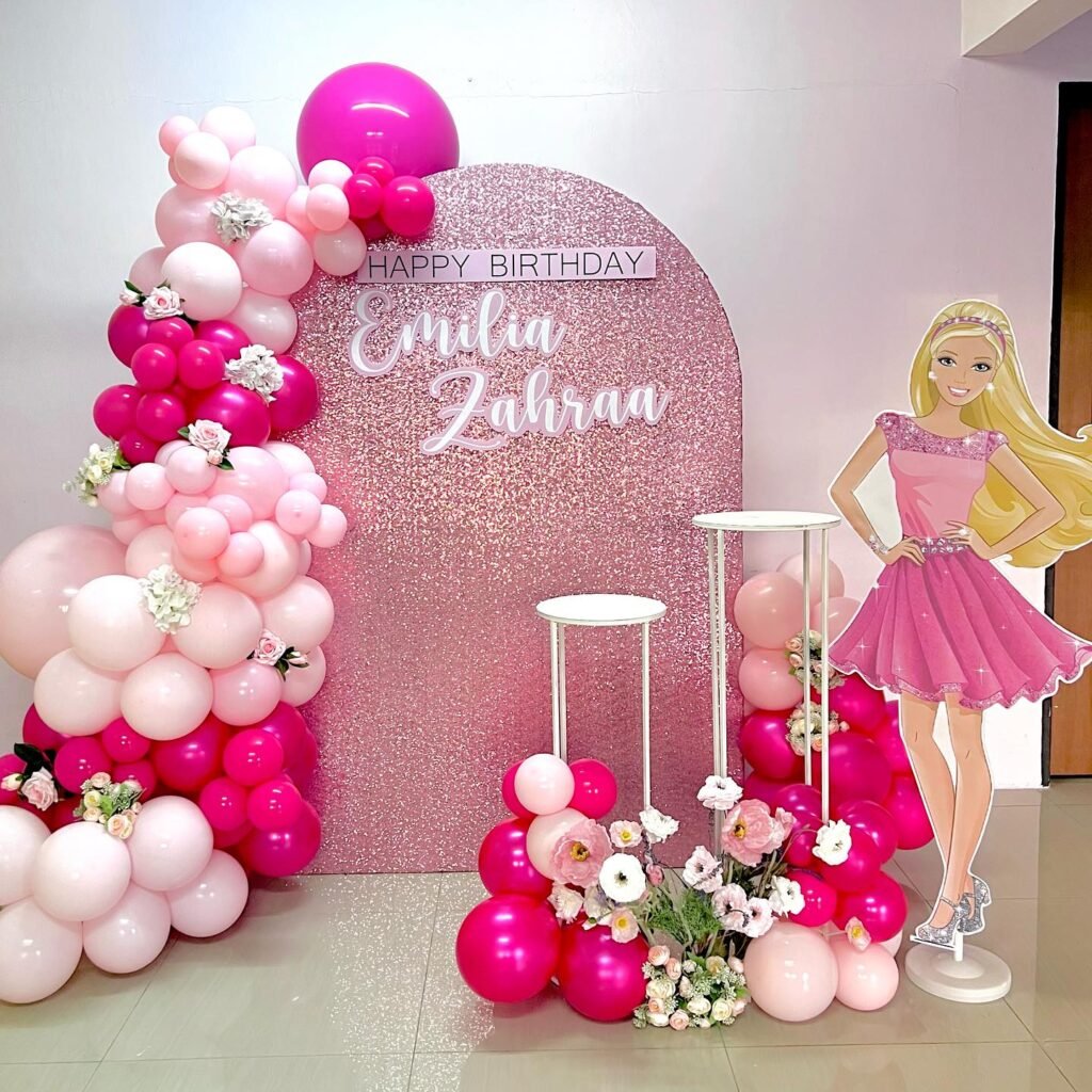 A customized Barbie box, ready for photos, is a highlight. Balloon garlands in various shades of pink frame the backdrop, adding a soft and voluminous touch to the display.
