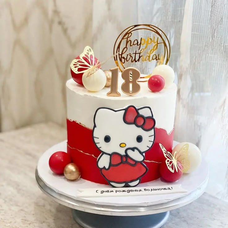 An adorable Hello Kitty figurine is the centerpiece of the cake. Golden and red balls, along with delicate butterflies, add to its whimsical charm. The golden “18” topper makes it extra special.