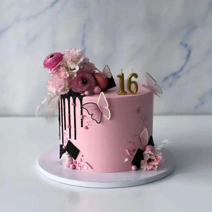 The cake is adorned with delicate butterflies, fresh flowers, and edible chocolate pieces. A golden “16” topper celebrates the special milestone. It feels both whimsical and sophisticated.