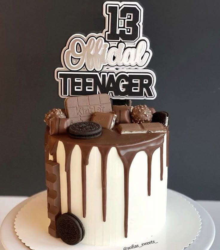 A striking “Official Teenager” topper celebrates a big milestone. The generous chocolate drip adds a decadent, appealing look. Every slice promises a sweet, rich flavor.