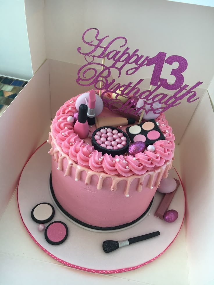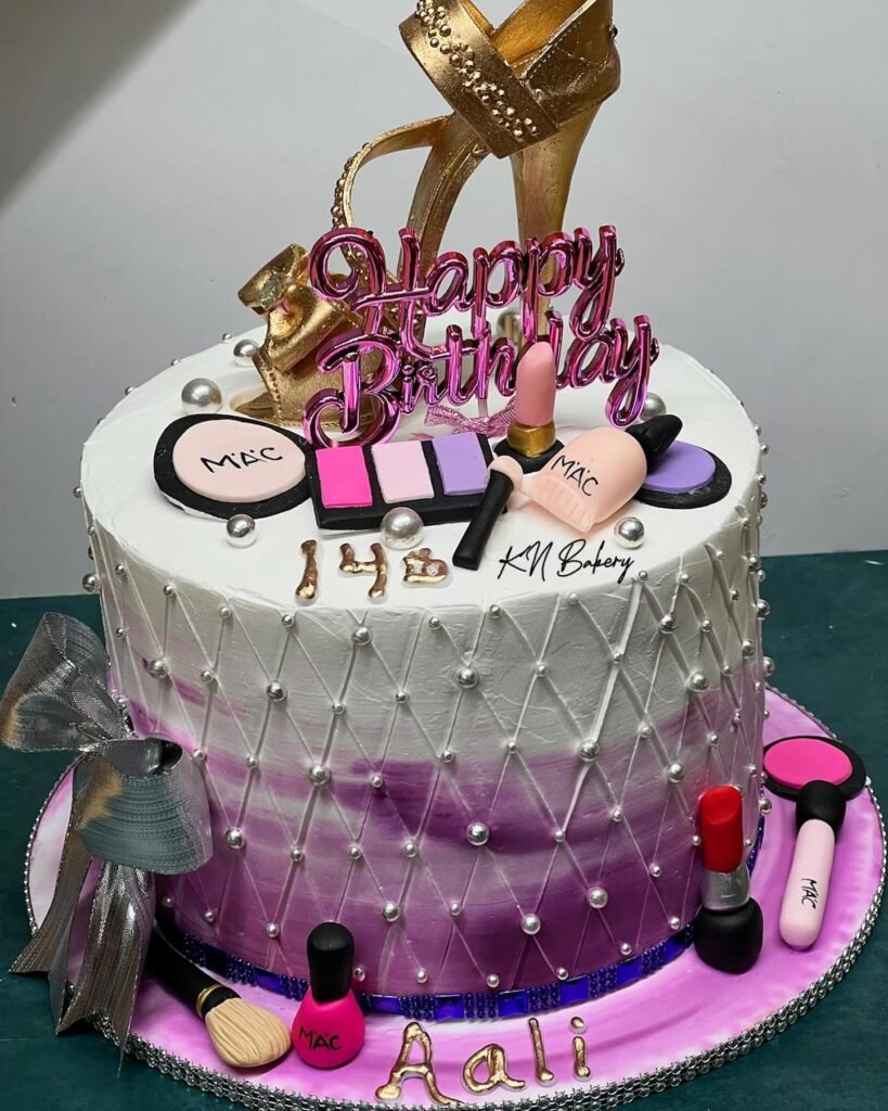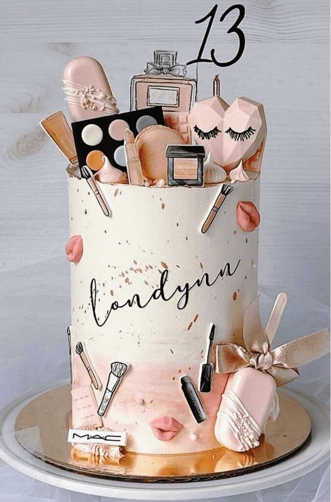 This cake is perfect for celebrating a milestone birthday. It is a creative, visually appealing treat for a beauty enthusiast. This is a special way to celebrate a new chapter.