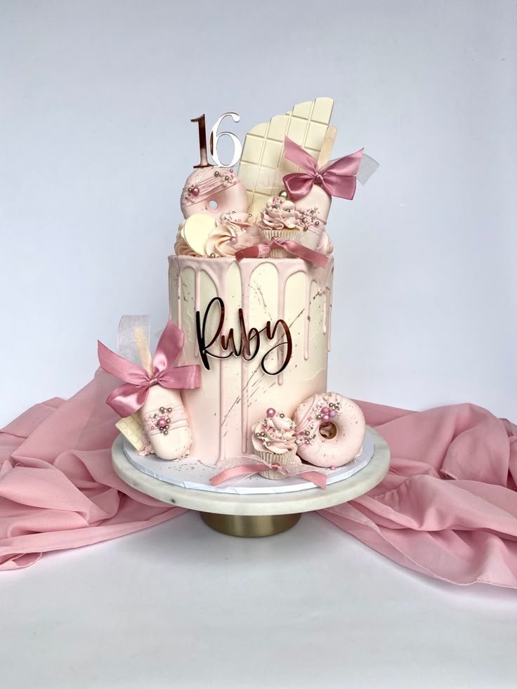 A glittery “Happy 13th Birthday” topper makes the cake extra celebratory. The beautiful pink swirls and elegant drip icing add a fun touch. It’s truly a work of art.