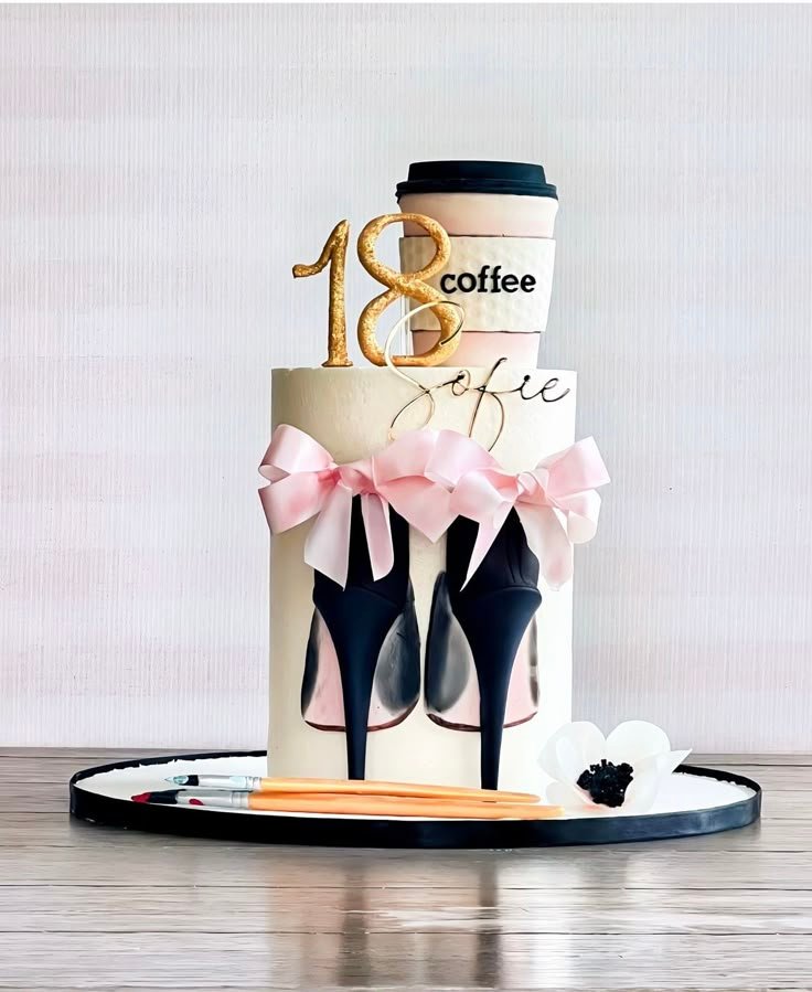 This elegant cake is a statement piece for an 18th birthday. It features a stylish pair of high heels and a coffee cup. This design feels mature and chic.