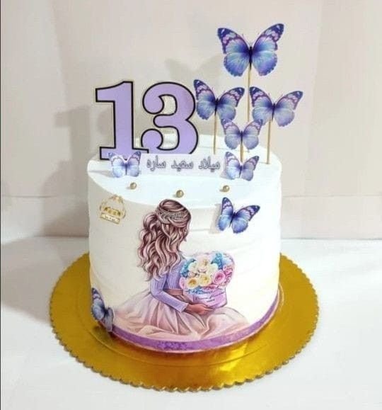 Several butterflies appear to float above the cake. A large “13” topper marks the milestone of becoming a teenager. The delicate design is truly enchanting.