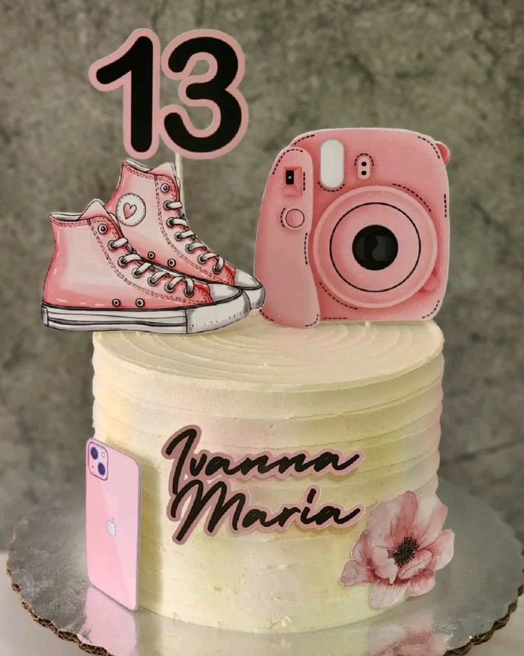 A large “13” topper marks the beginning of the teenage years. The side of the cake features a phone and a beautiful flower. It’s a sweet and personalized design.