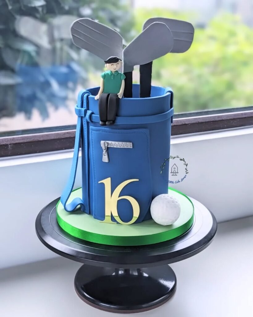 This cake is a hole-in-one for any golf enthusiast. The detailed design shows a blue golf bag, complete with clubs and a charming golfer figurine. It’s an ace of a cake.