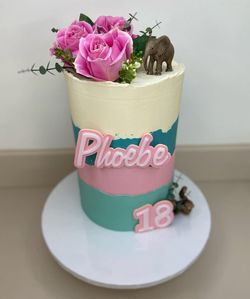 A charming elephant figurine and lush pink roses add a touch of whimsy. The personalized name “Phoebe” and the age “18” make this cake uniquely hers. It’s a beautifully handcrafted design.