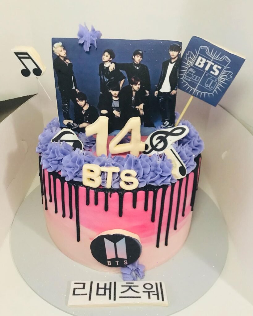 This cake is a dream for any K-pop fan, featuring the popular band BTS. The purple and pink ombre design is accented with a striking black drip. It’s a stylish and fun tribute.