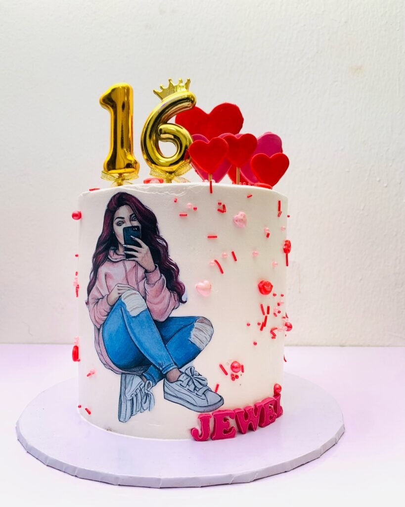 This cake is a trendy and personalized tribute to a special teenager. It features a hand-painted girl taking a selfie, making the design fun and relatable. It’s a sweet way to celebrate.