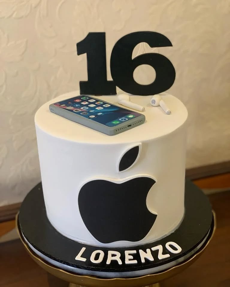 This sleek cake is a must for any tech-savvy teen. The clean white design features a large apple logo on the side. It feels modern and stylish.