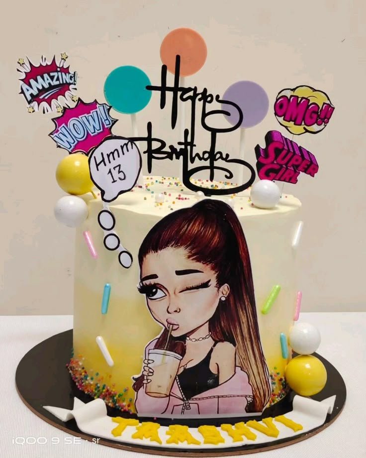 A stylish illustration of a winking pop star adds a unique, trendy element. Speech bubble cutouts like “Amazing!” and “OMG!” express the excitement. This cake truly stands out.