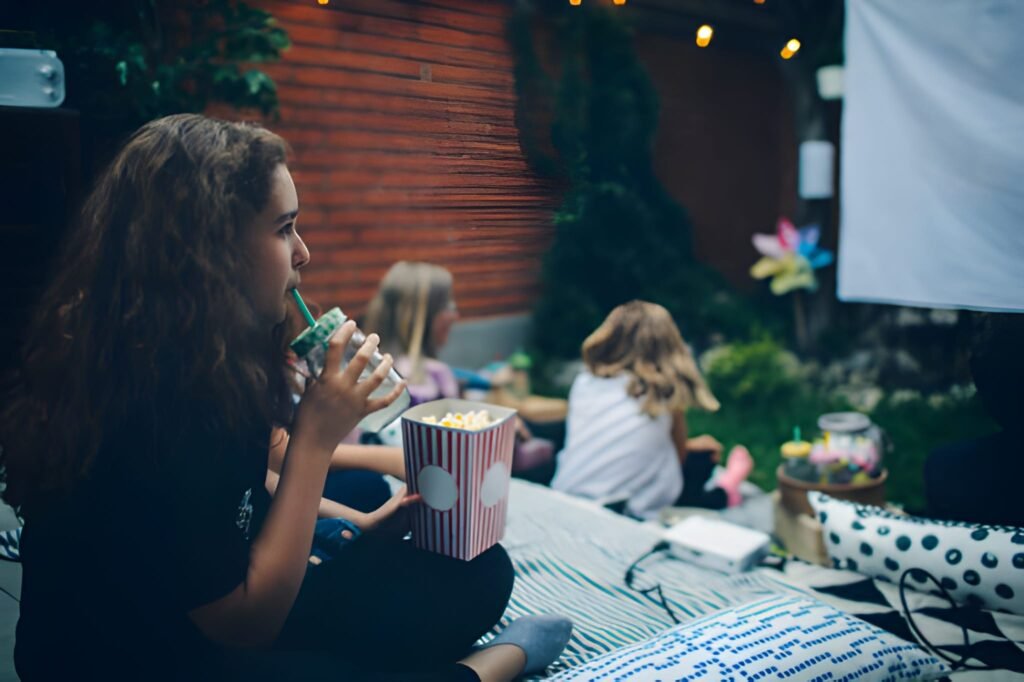 To make it special, I created a “concession stand” with popcorn, candy, and soda so the kids could help themselves. We used a projector for a big-screen feel, but a large TV works just as well. I tossed a bunch of pillows, blankets, and beanbags on the floor to make a super comfy viewing area. It’s a simple, cozy, and fun way to celebrate.