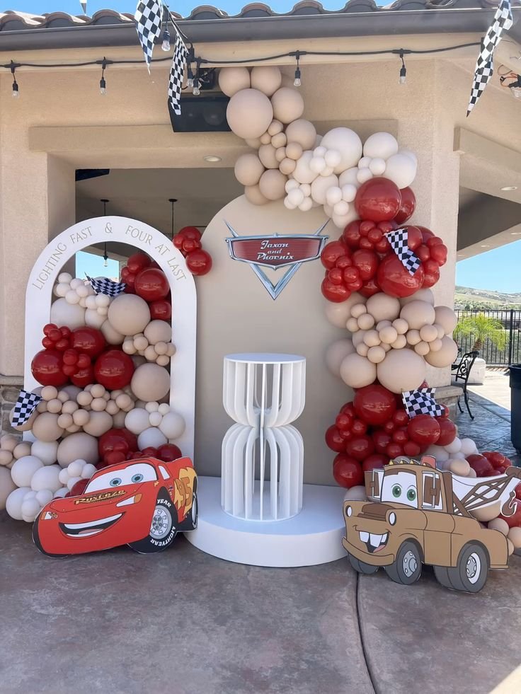 Welcome guests to a high-speed Cars movie themed birthday with this impressive outdoor balloon arch display. Custom cutouts of Lightning McQueen and Mater cheerfully greet everyone, standing against a backdrop of flowing balloon garlands in rich red, warm beige, and crisp white. Checkered flags accent the top, signaling racing excitement.