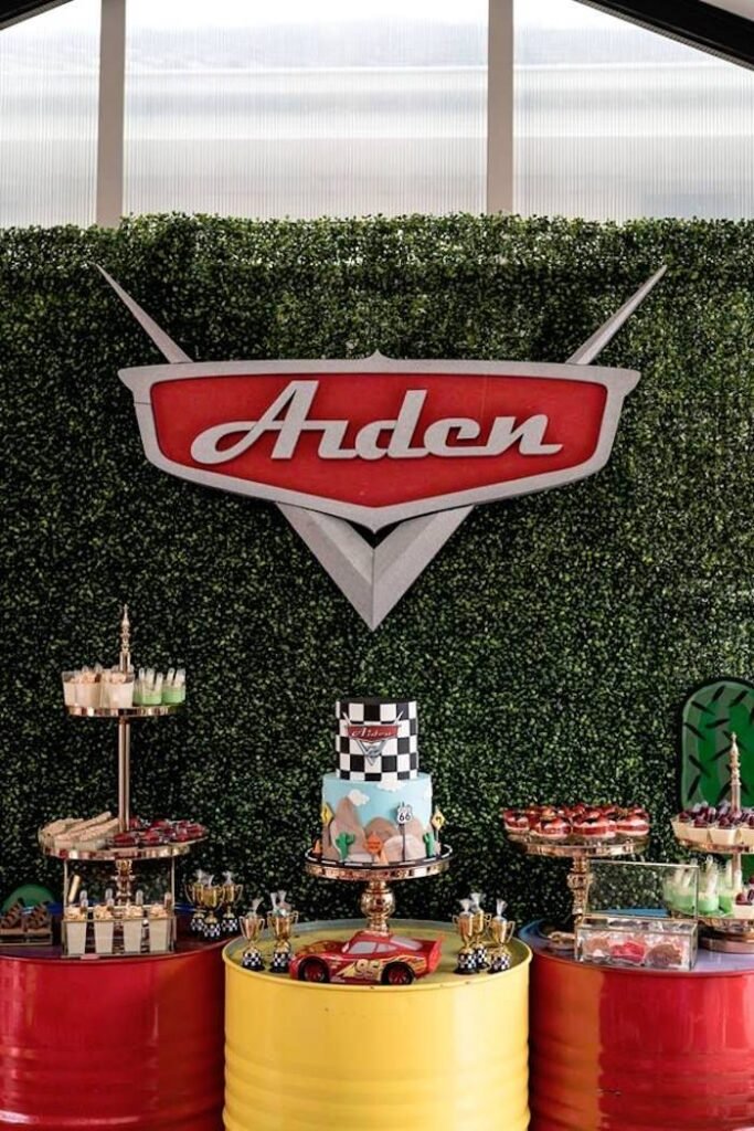 Set the stage for a thrilling Cars movie themed birthday with a vibrant dessert table display. A lush green backdrop adorned with a personalized “Arden” racing logo immediately grabs attention. Below, a beautifully decorated birthday cake featuring a checkered flag and desert landscape takes center stage, promising a sweet victory.