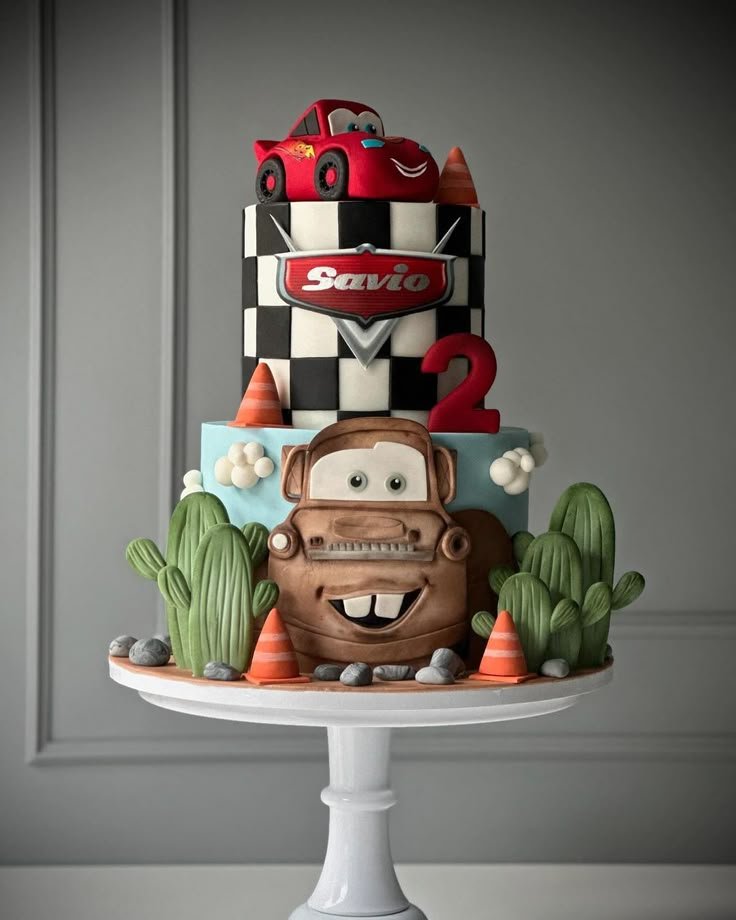 Celebrate a Cars movie themed birthday with this stunning two tier cake, custom made for Savio’s second birthday. The bottom tier features a friendly Mater, surrounded by green cacti and orange traffic cones, creating a charming Radiator Springs landscape. Fluffy white clouds add a whimsical touch to the desert scene.