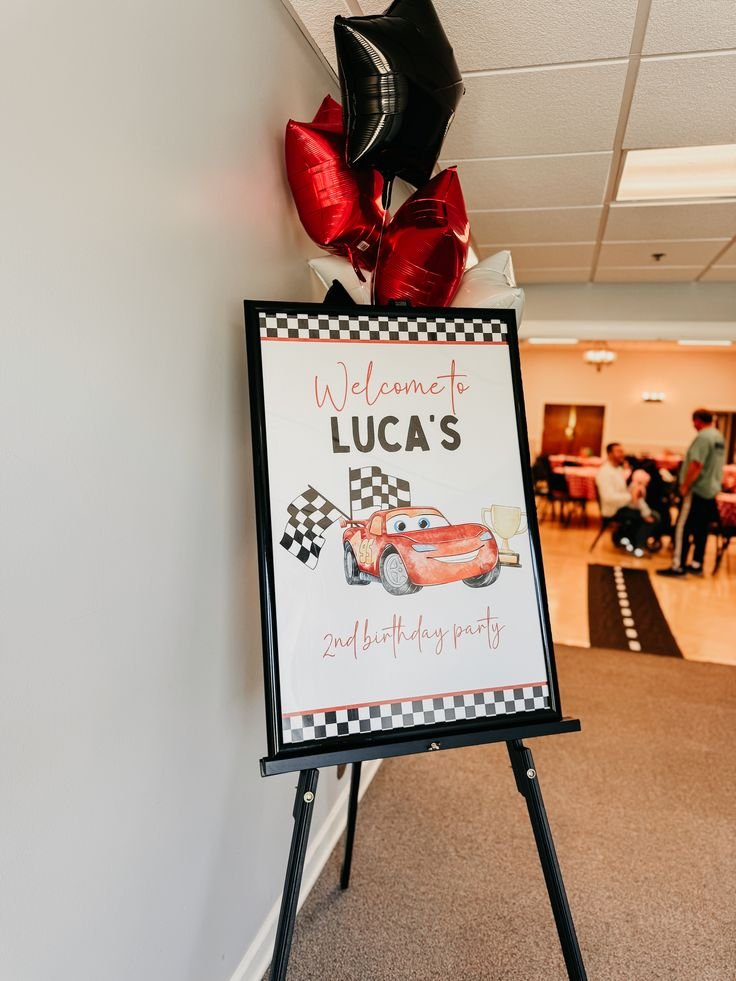 Welcome guests to an exciting Cars movie themed birthday with a personalized welcome sign like this one for Luca’s 2nd birthday. The sign features a cheerful illustration of Lightning McQueen, complete with checkered flags and a celebratory trophy. A bold checkered border frames the design, setting a festive racing tone.