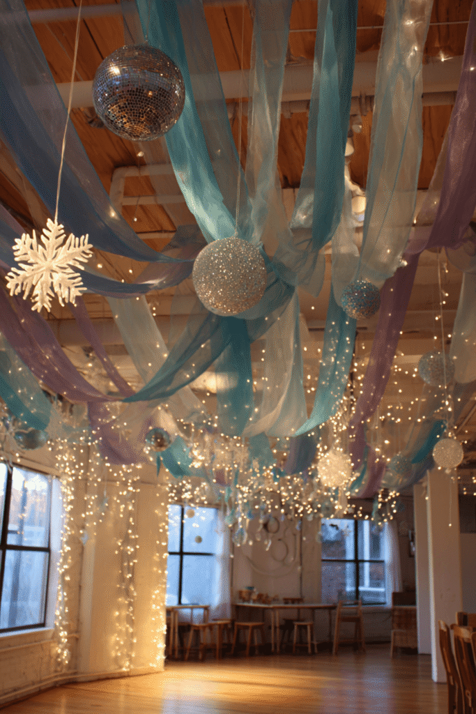 I also suspend large ornaments at varying heights using clear fishing line. It looks like they’re floating in air. For a winter wonderland effect, I hang paper snowflakes in different sizes.