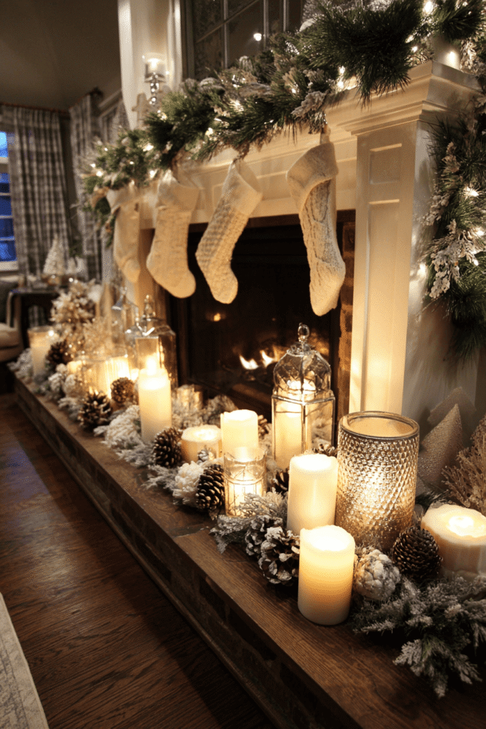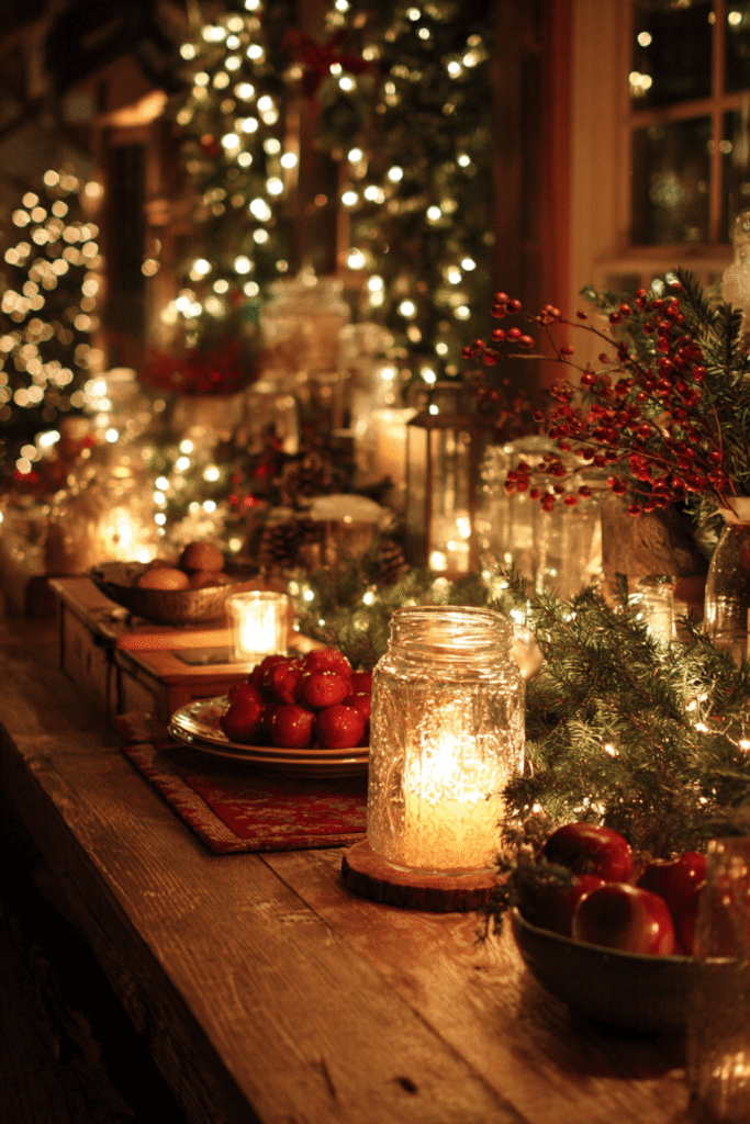 I add variety with different textures: pinecones, berries, and small ornaments. The key is layering heights with candles of different sizes. I use pillar candles in glass hurricanes for safety and add smaller votives throughout.
