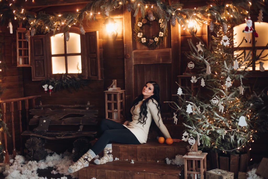 I provide props in a decorative basket: Santa hats, reindeer antlers, festive glasses, and signs with Christmas sayings. I also include a few wrapped empty boxes and a small artificial tree as props.
