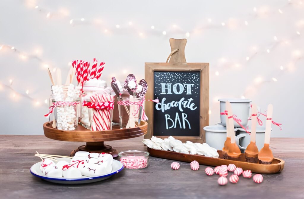 The toppings are where I get creative: marshmallows, whipped cream, cinnamon sticks, peppermint sticks, and chocolate shavings. I use small chalkboard signs to label everything, and add string lights around the table edge.