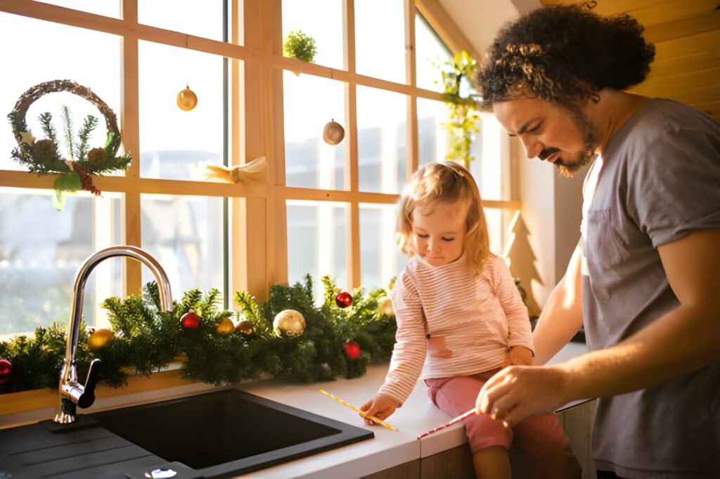 The kitchen often becomes party central, so it deserves special attention. I hang garland above cabinets and wrap it with string lights. I replace regular dish towels with festive ones and display holiday-themed dishes.