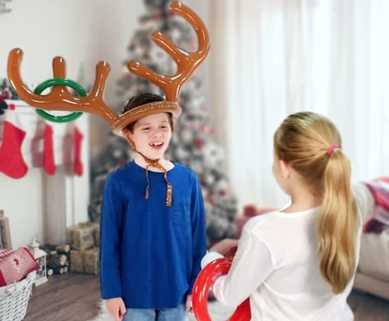 Reindeer Antler Ring Toss is always a laugh. One kid wears antlers (inflatable or homemade), and the others toss soft rings.
